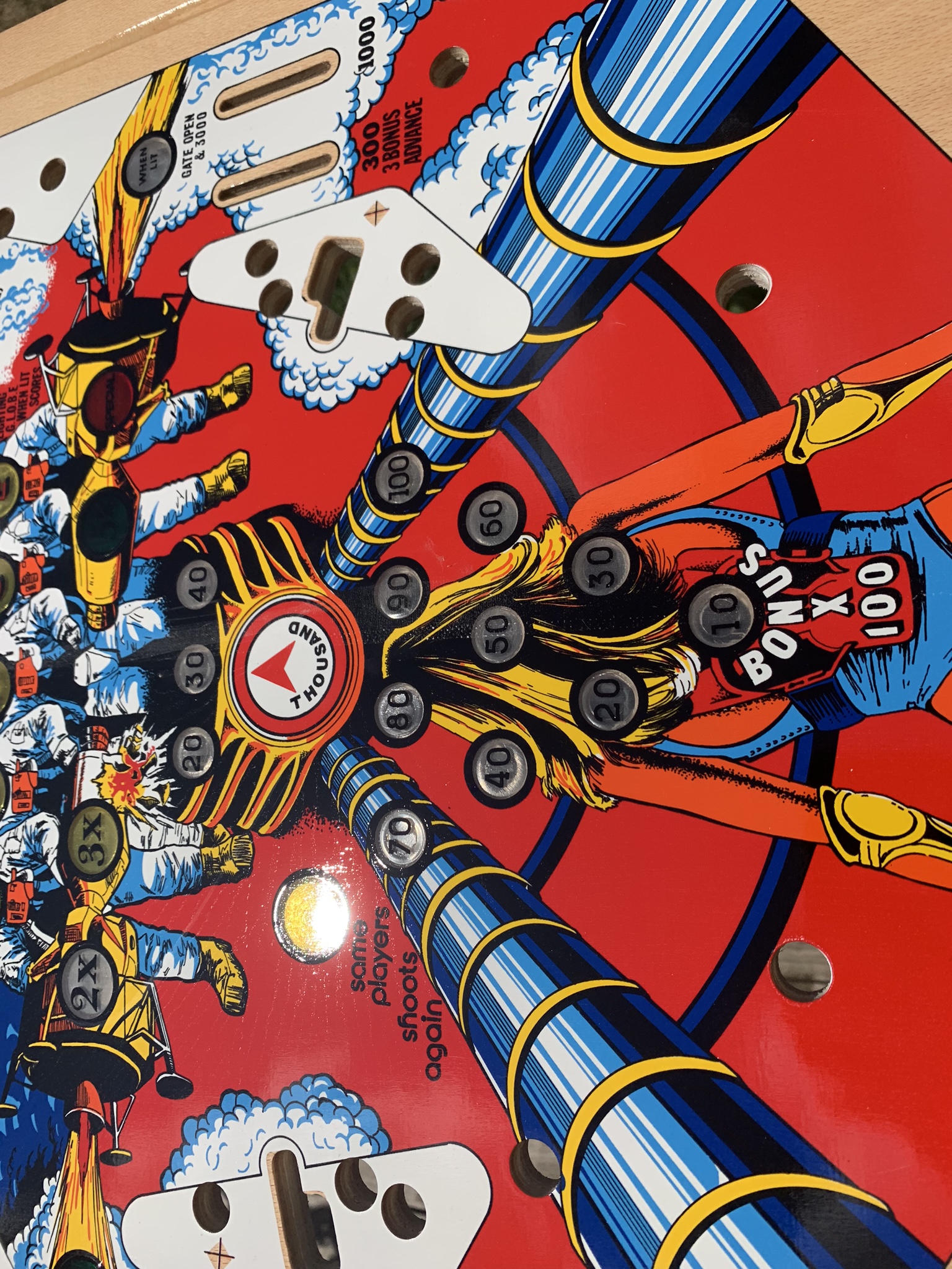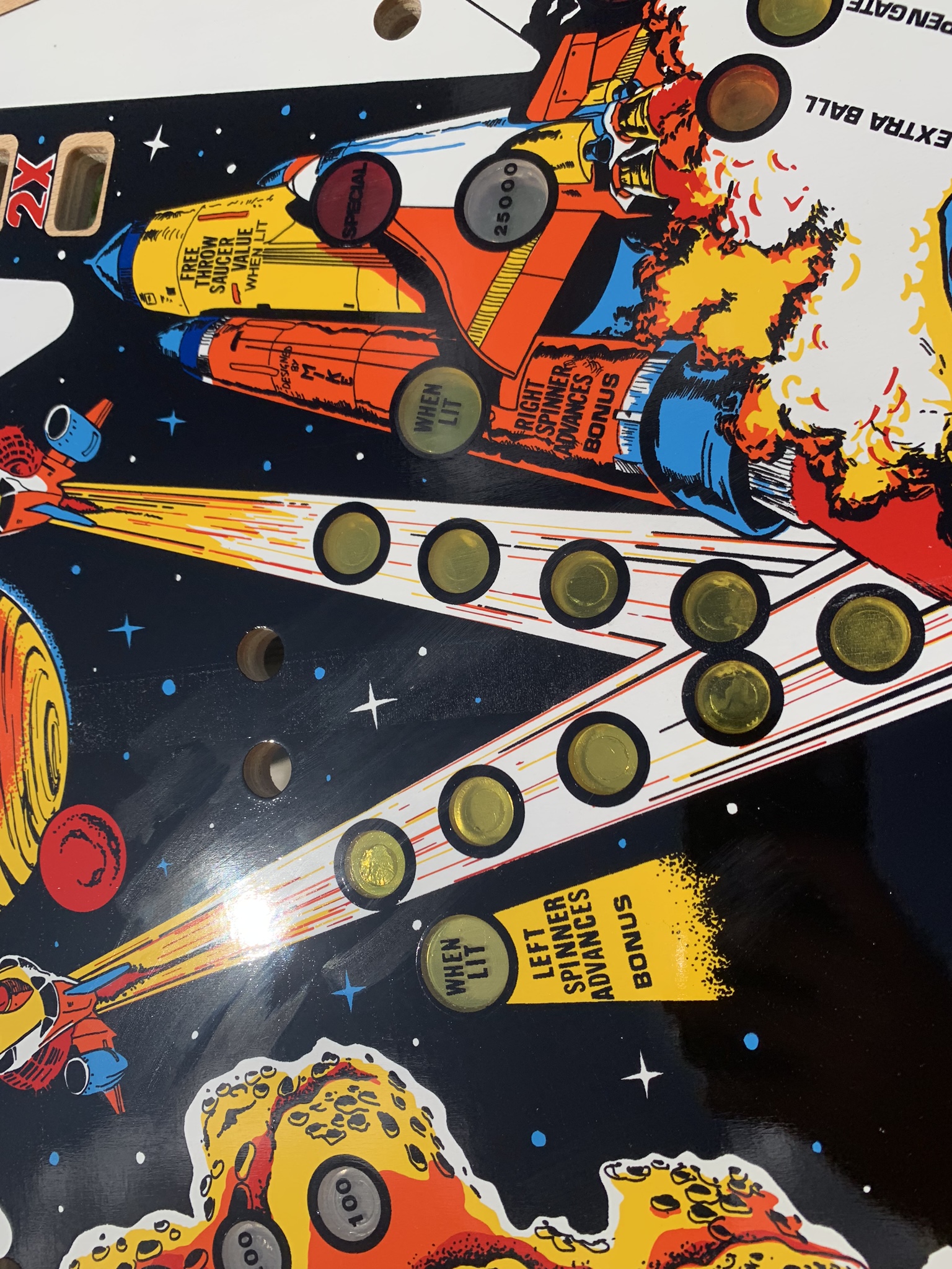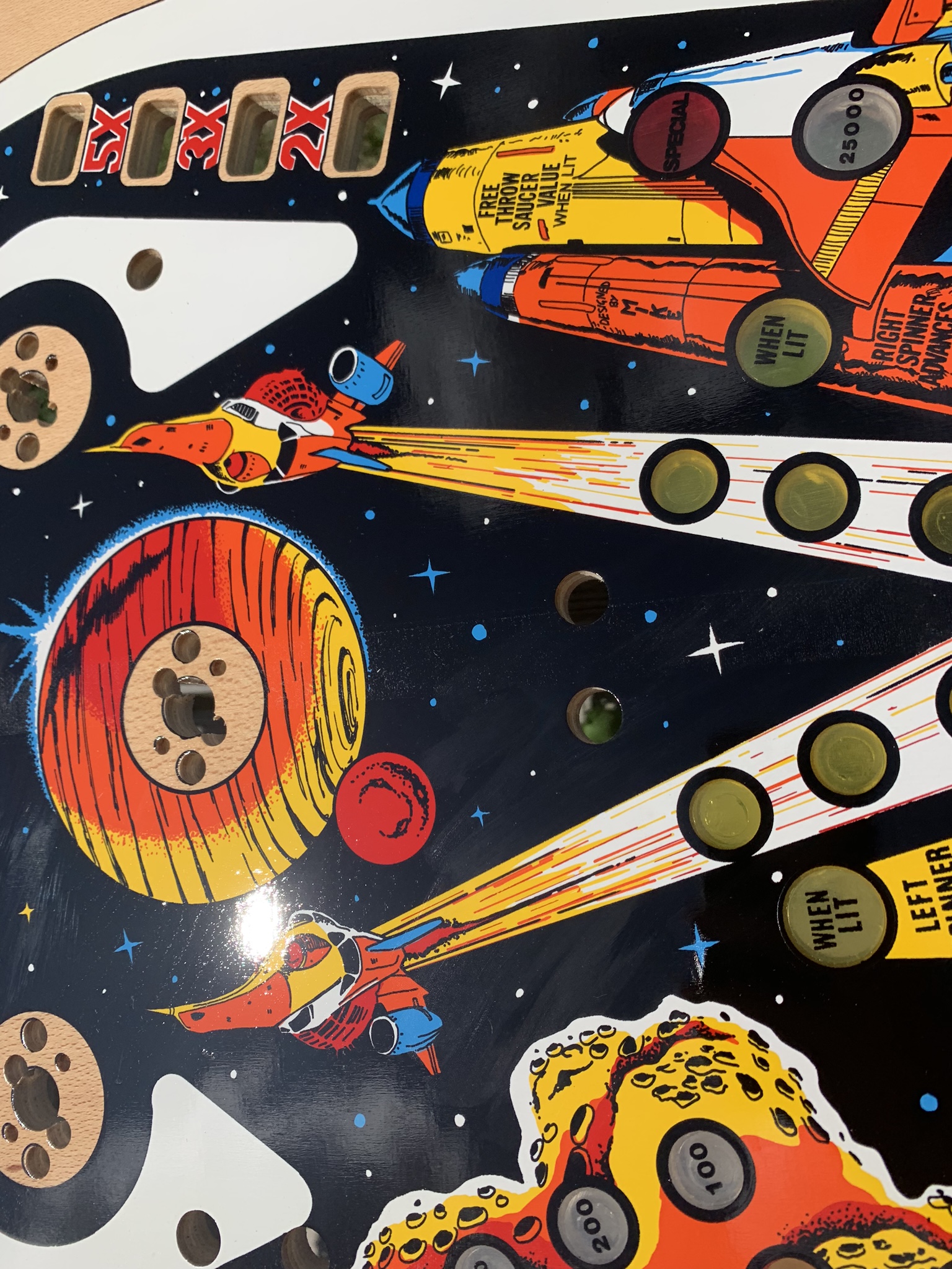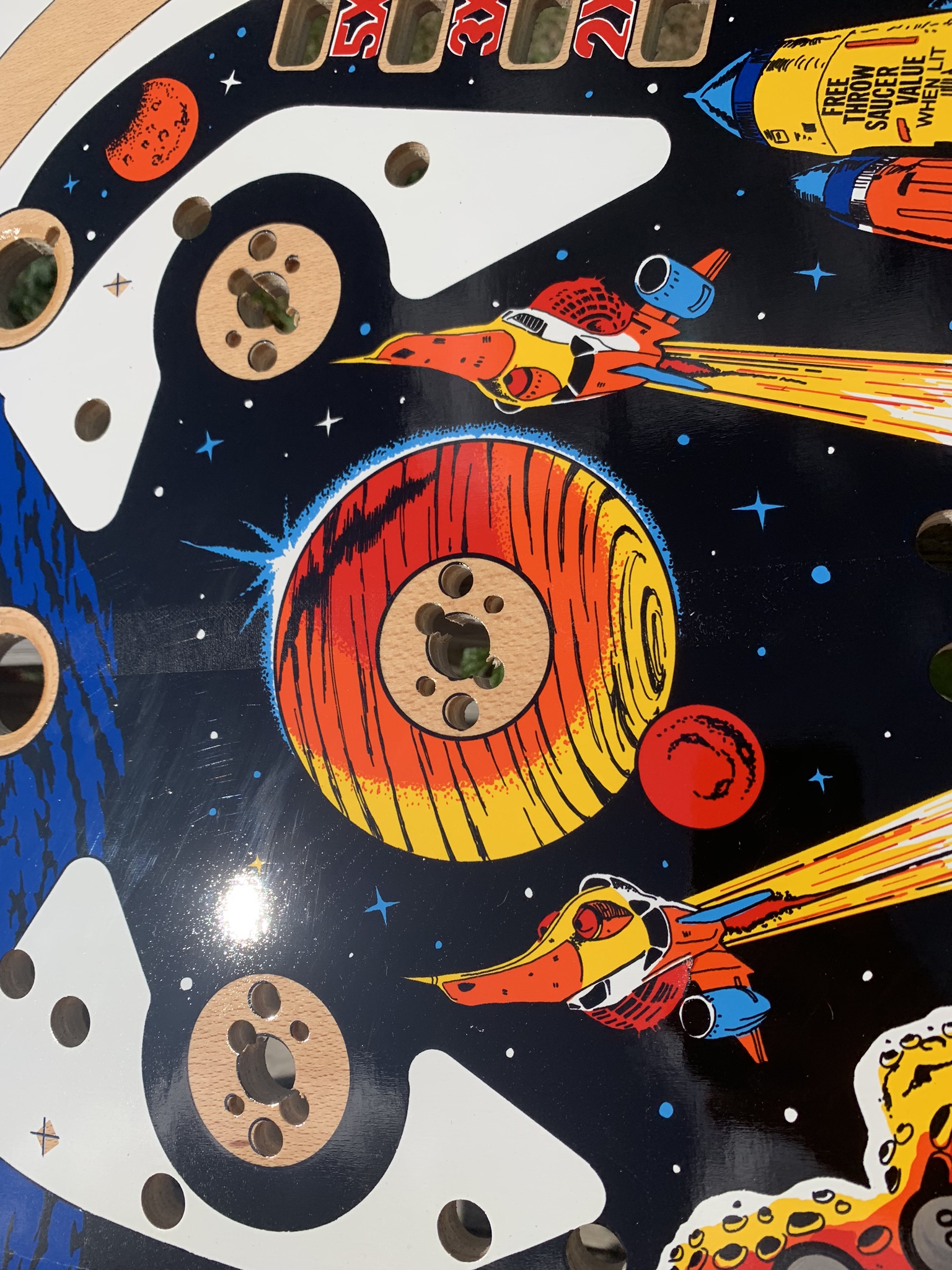This playfield can be drilled and dimpled as well, and of course I can always add my clearcoat services as well. With an item this rare and unique I would actually go so far as to recommend my drill, dimple, & clearcoat if you plan to install it in a machine, but if you are just purchasing it as a unique and rare wall decoration or collectible skip the clearcoat and just spring for shipping in one of my custom crates to insure that it arrives to your doorstep safely. The playfield does come with a complete set of plastics as well for the $1100 price tag, if you do not plan to install in machine and would be interested in purchasing just the playfield I could let it go for $1000.