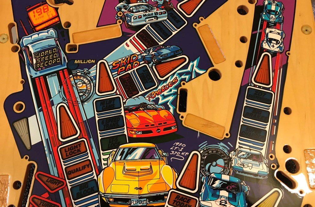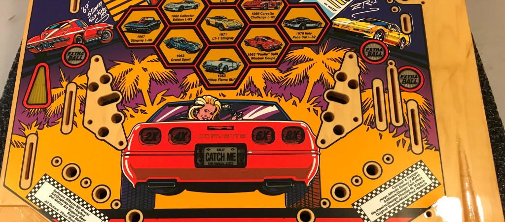 Is there anything sweeter than revving the engine on a corvette, and taking a good looking blonde cruising down the highway? Based on the art on this amazing NOS playfield I think installing this into your Corvette Pinball machine may be the only thing that is better! One of George Gomez’s earliest designs this machine shows his love of the classic Corvettes, and modern thoughts about pinball layouts and design. A machine that is pursued by car collectors and pinball enthusiast alike, it is seldom you can find a NOS version of this playfield. There are reproductions out there, and although I am very thankful there are companies making playfields to save these games, we all know that nothing competes with NOS. This playfield will need drilled and dimpled, both of which are services I can provide, in addition to my clear coating that can be added on. Let me know if you have any interest in purchasing this playfield and getting it your machine tuned up to play like it did the day it left the factory!