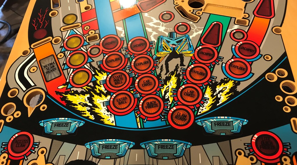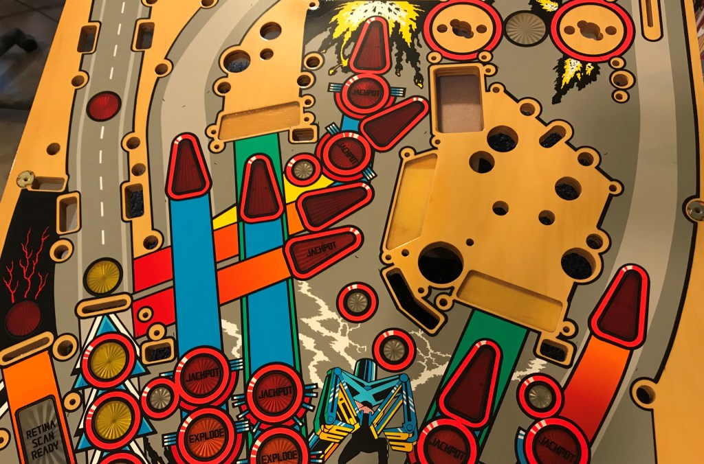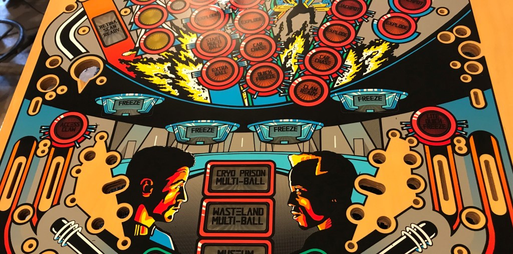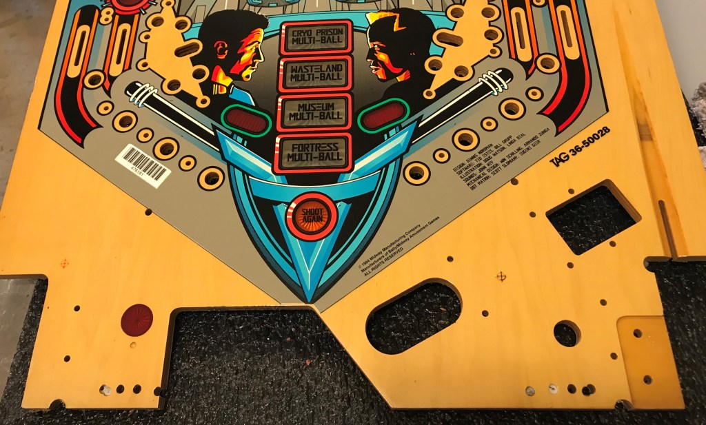 SOLD-A sleeper hit film in the 90s, gave us the breakout performance of Sandra Bullock, Rocky as a cop in the future frozen from the past, Wesley Snipes as a criminal from the past playing his arch nemesis, and a future that seems all but far far to improbable nowadays somehow delivered us this amazing fun pinball machine designed by Dennis Nordman. Look if you don’t know what the three shells are for, don’t ask. This playfield is NOS and in amazing shape. I think this is the fastest and flowiest of all the widebody machines out there, and do to licensing issues with this particular title I think it is incredibly unlikely you are ever going to see reproductions of this title done, so here is your one chance to make your machine factory fresh by buying and installing this beauty. I can add on my drill and dimble service as well as my perfected clear coat. Get your gun handles chromed out, new ramps are coming in the near future, and install this beautiful playfield and you’ll feel just as good as Stallone and Bullock after putting the flower wreaths on your head! – SOLD