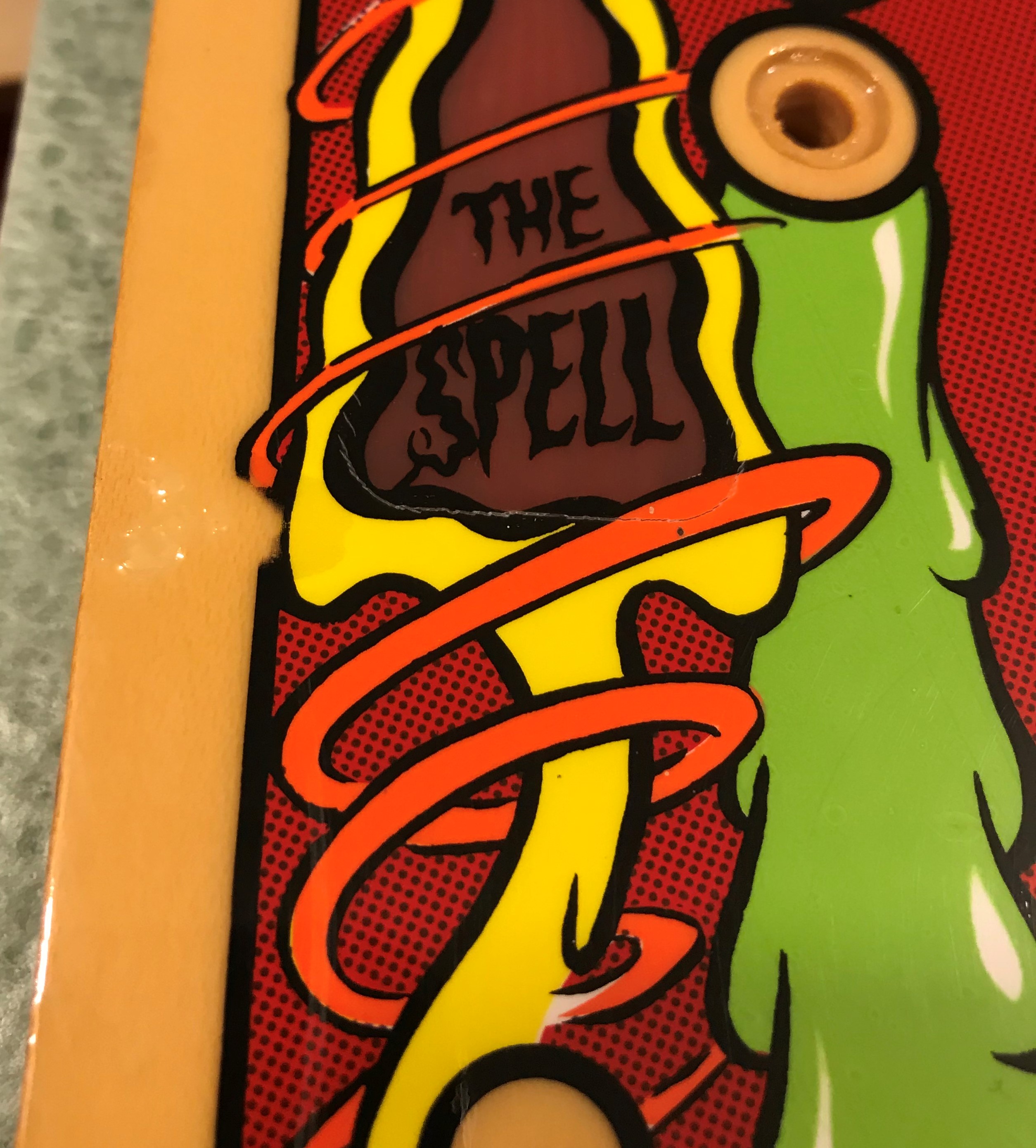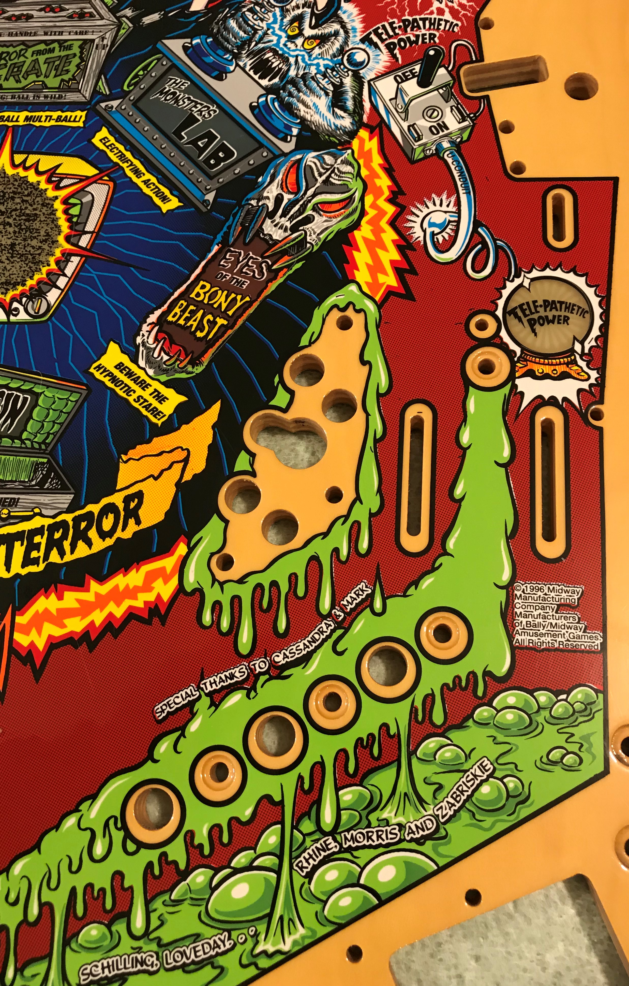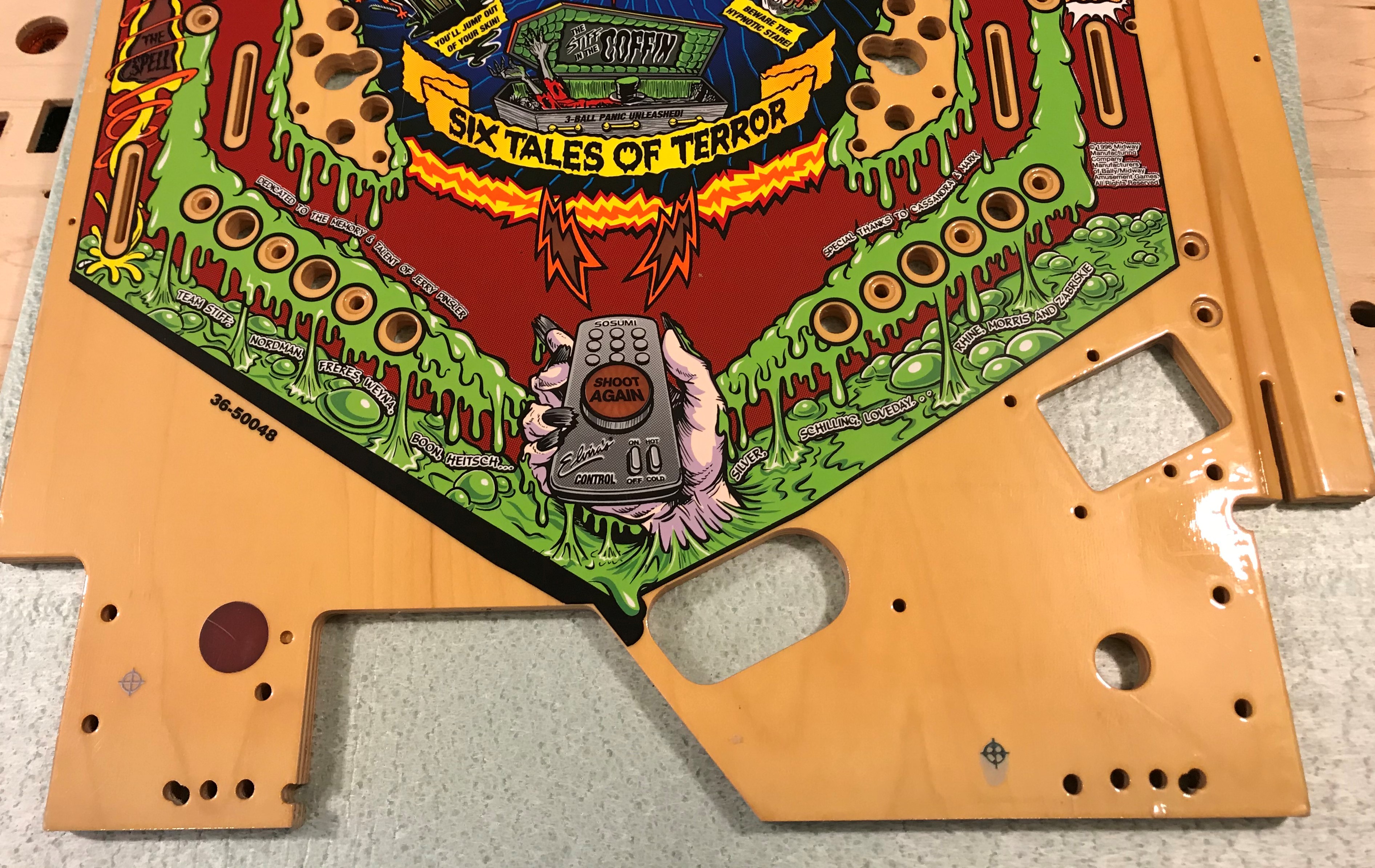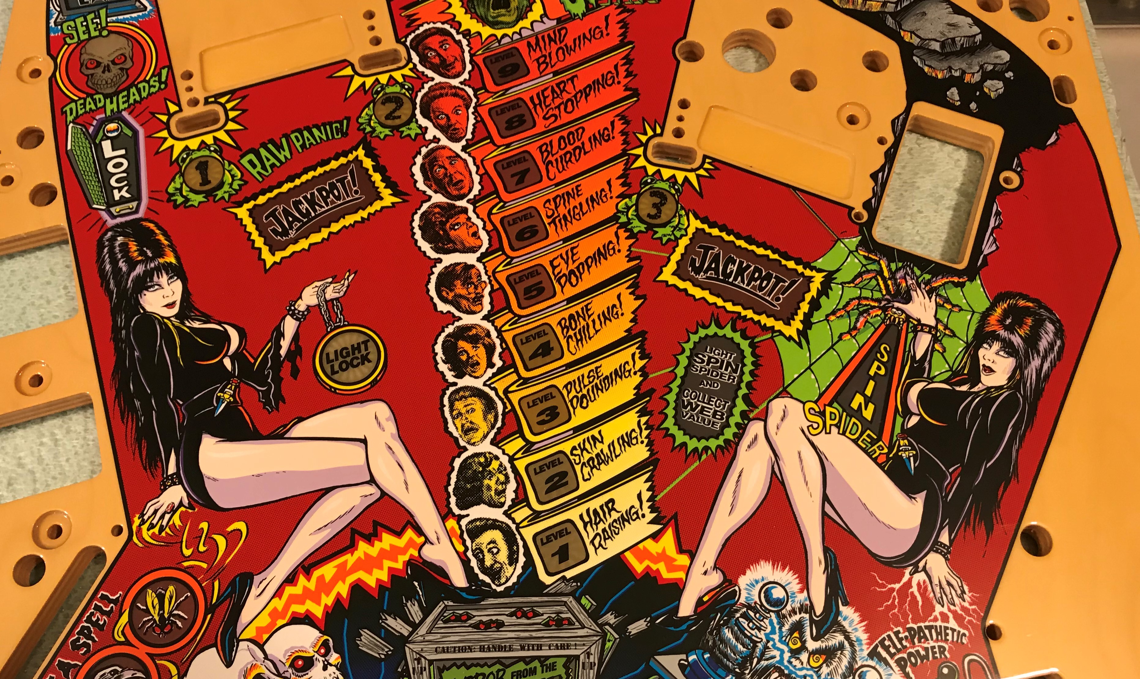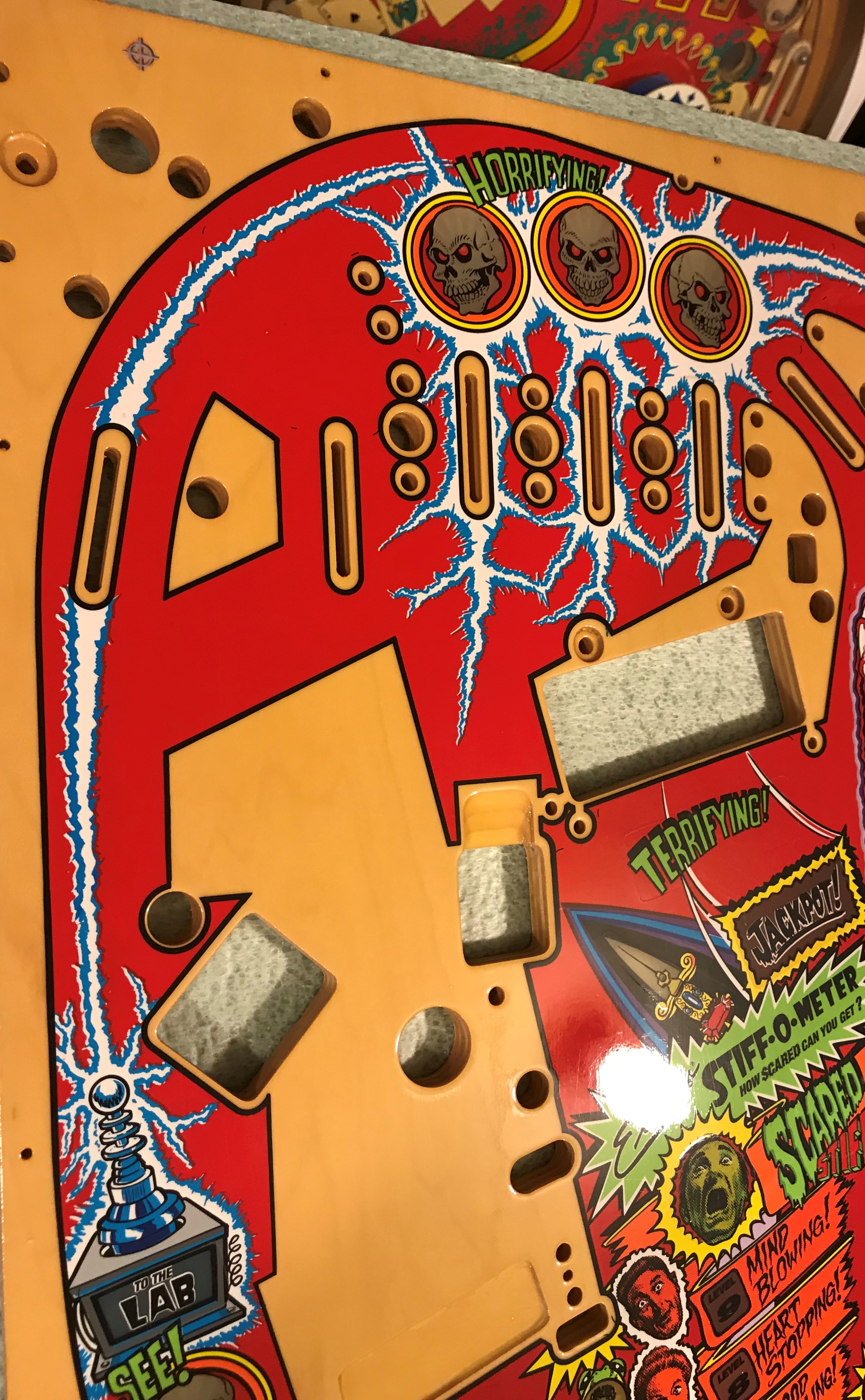 SOLD-The horror and pinball icon herself, Elvira has never looked better, and your machine will never look better than after you install this beautiful NOS Scared Stiff playfield! A masterfully designed game by Dennis Nordman, it brings the fun, funny, and flow all together in a package that is hard to beat. You and your friends will have stiff-o-meters off the charts when you see this playfield installed into your machine! What may be the game with the most adult humor ever, Scared Stiff is a classic A title for so many reasons. The beautiful rich and vibrant colors really stand out on this beauty, and although there are a few small print defects these can be easily touched up and perfected before I clearcoat it for you. This playfield has been drilled and dimpled and is ready for install! -SOLD