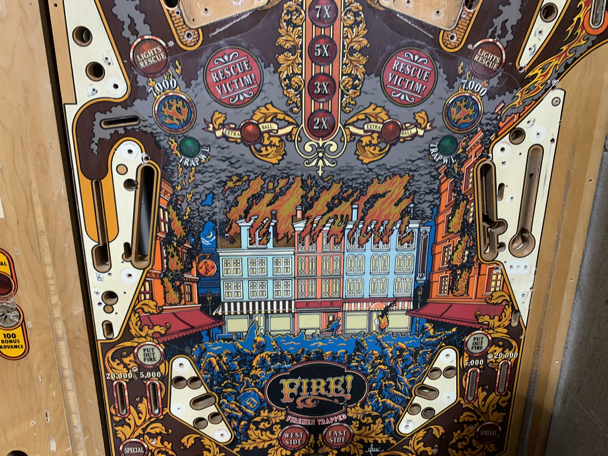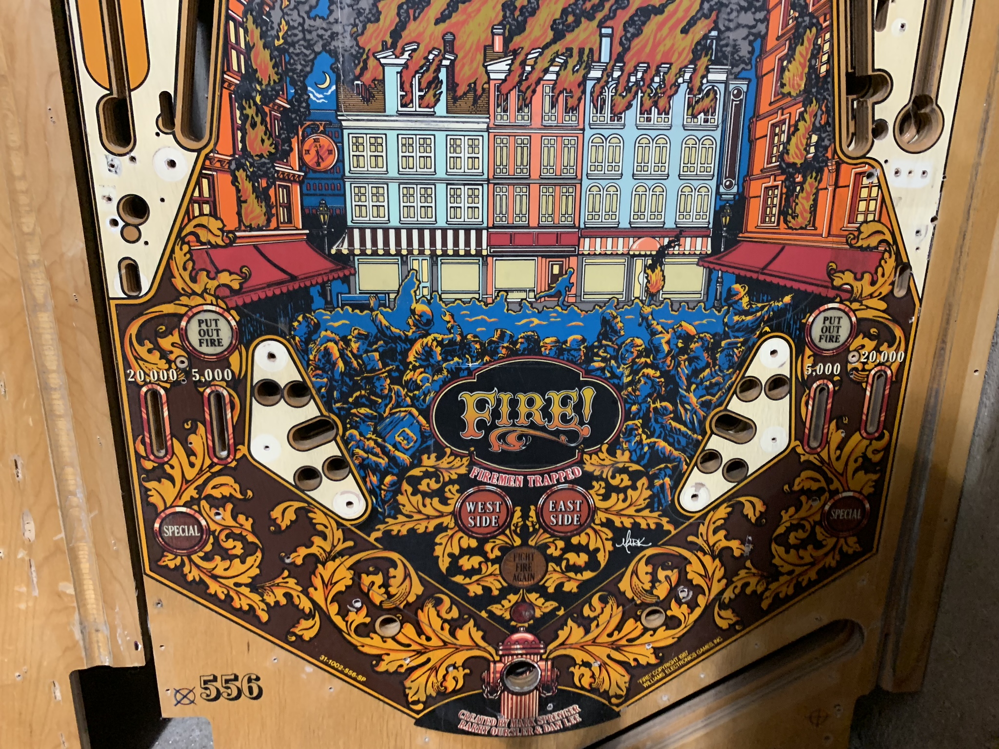 So in this case we actually have two different Fire! playfields available, one is a black, and one is a champaign. Both are only $125. this is one of those game where the art sucks you in and the shots keep you coming back. An incredibly beautiful package with some of the coolest ramps and 3D-formed plastics used in a pinball machine. Your choice both in similar condition, either one is $125.