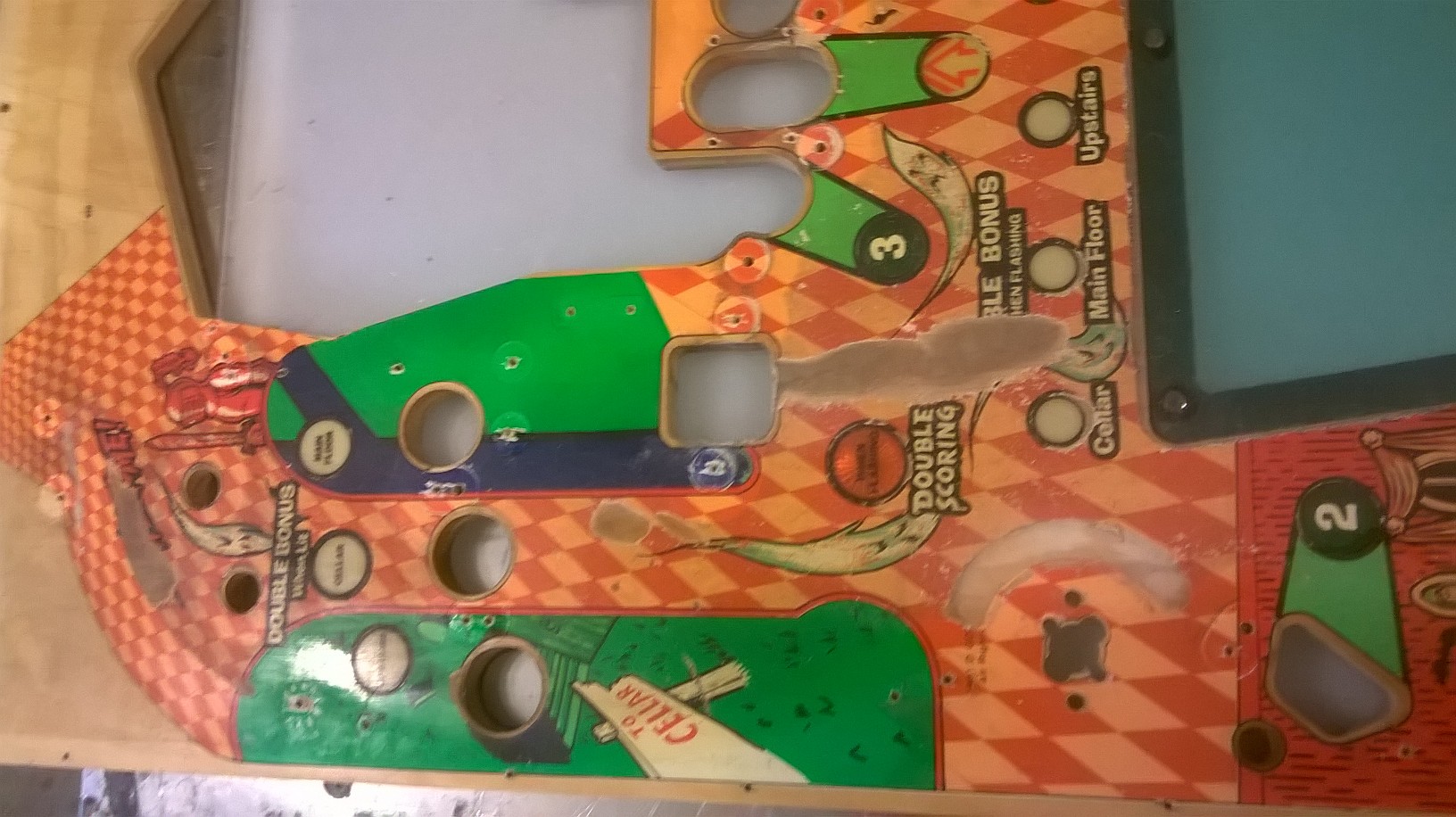 The first tri-level game! An amazing theme and art package. Sure this game just had reproductions made, but everyone knows an original is better, and more importantly cheaper. This playfield is a great restoration candidate. I also have the other playfields available, and several parts from this game, but make it yours for only $200 and get that budget minded restoration started!