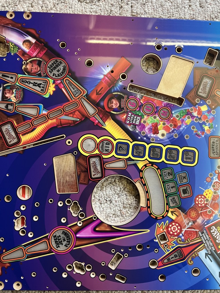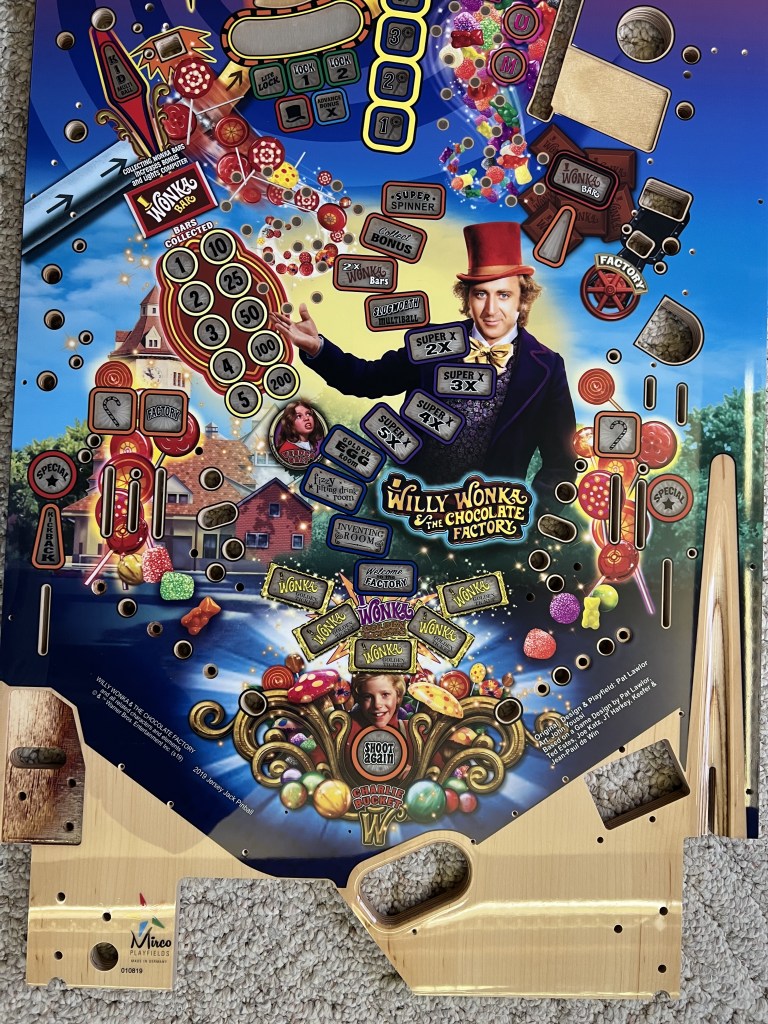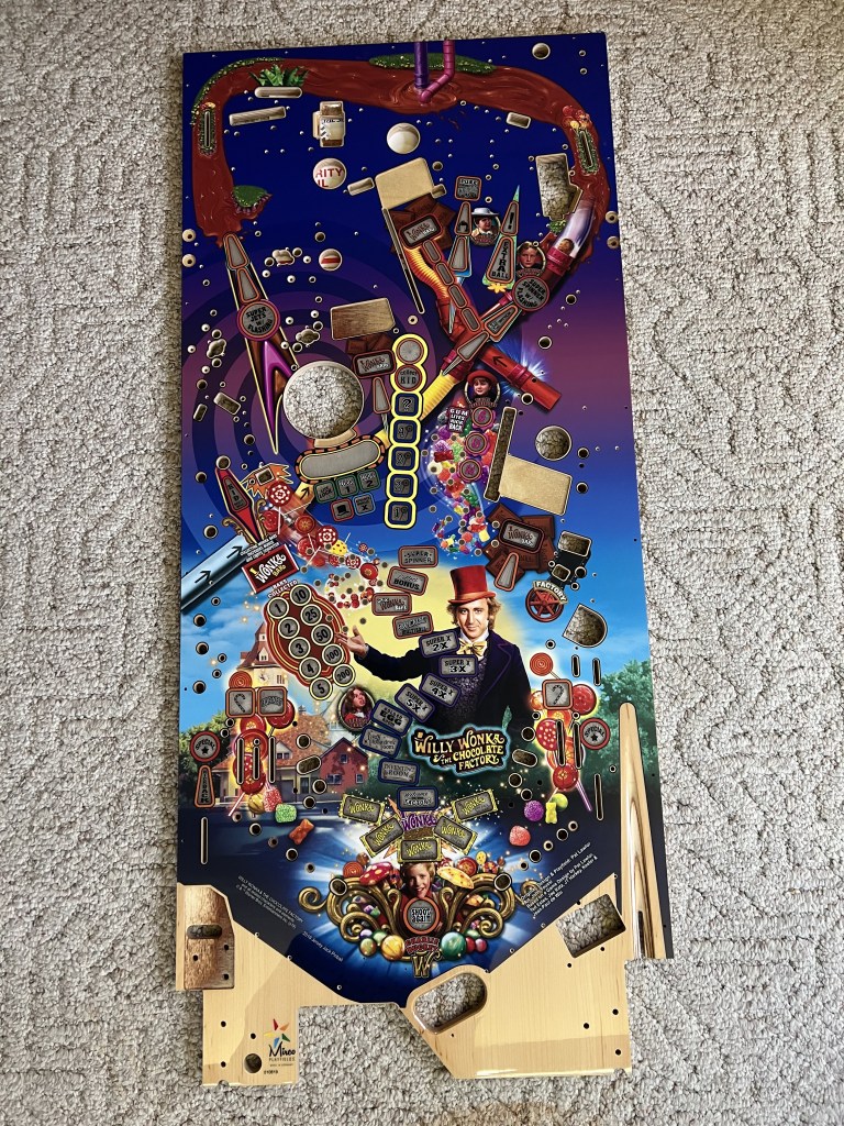 We all know that JJP, like many playfield manufacturers have had some playfield issues, and if Willy Wonka is your favorite you are going to want to have a backup plan for when your playfield starts to get damaged. Here we have a brand new Willy Wonka LE playfield, add my clear coating services and you know it will be good for longer than any of us will be around!